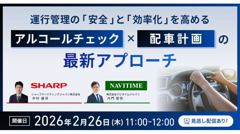シャープマーケティングジャパン、ナビタイムジャパン共催ウェビナー!運行管理の「安全」と「効率化」を同時に高めるには?アルコールチェック×配車計画の最新アプローチをご紹介