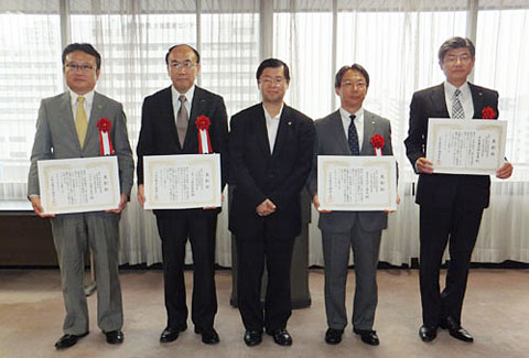 小宮山厚生労働大臣(左から2人目)と受賞企業の代表者 右端が太田副社長