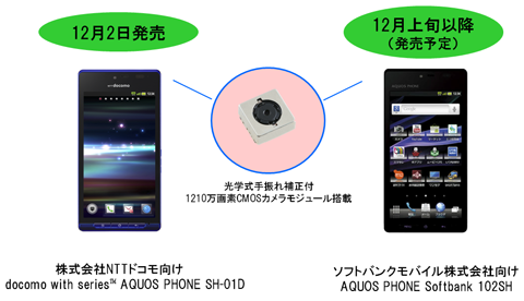 - ※1 2011年12月1日現在。光学式手振れ補正機能搭載1/3.2型1210万画素CMOSカメラモジュールとして(シャープ調べ)