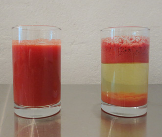 この「低速圧縮絞り」でできたのが左のジュース、「高速遠心分離方式」でできたのが右のジュースです。