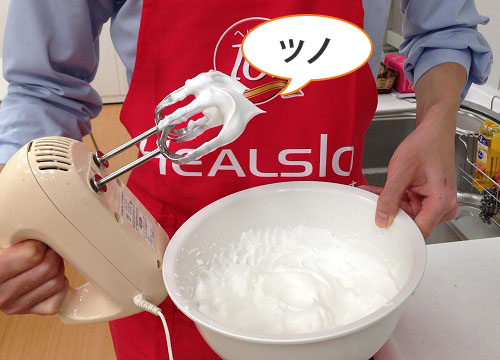 卵白は別のボールに入れて、ツノが立つまで泡立てていきます。
