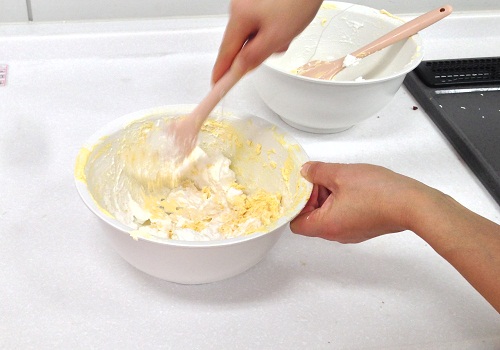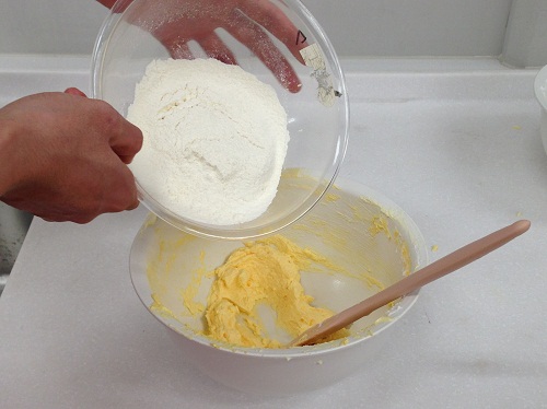 バター、砂糖、卵黄を混ぜたものに、卵白を泡立てたものを半量加えます。