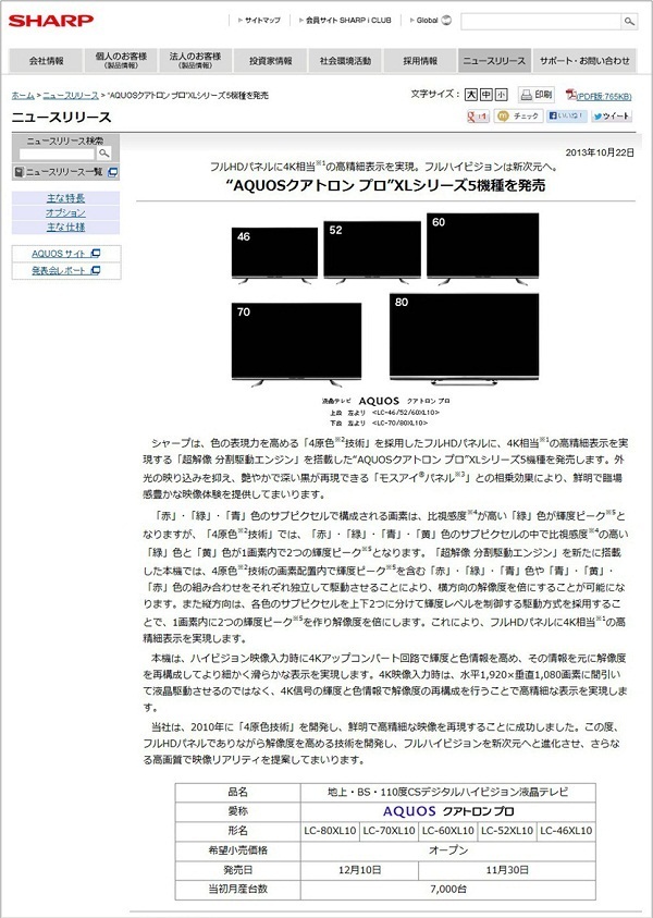 <ニュースリリースサイト AQUOSリリースページ>イメージ