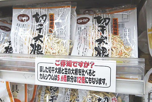 「グゥテレ」のコラム記事を参考に、切干大根が生の大根よりカルシウムが豊富なことをPOPで訴求されていました。