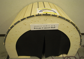 過去に展示された試作品の一つを特別に教えてもらいました。それがこちら、「プライベートコンサートホール」です。箱の中に顔を入れ、コンサート会場のような臨場感あふれる音を楽しむものなのだそうです。試作機ながらハードウェアの作り込みがすごい作品ですね。