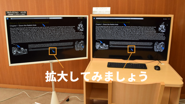 左がフルハイビジョン、右が4Kです。フルハイビジョンは、文字によっては読めないものもありますよね。4Kでは、小さな文字もはっきりと読むことができます。
