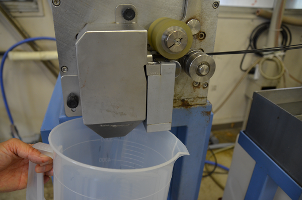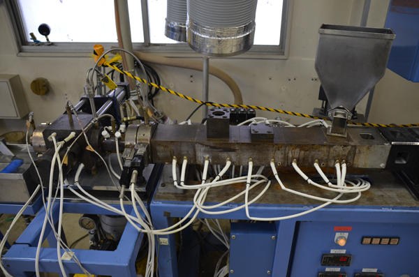 (荒井)まずは、粉砕した材料を装置に入れます。異なる材料をブレンドする際は、ここに混ぜたものを入れます。