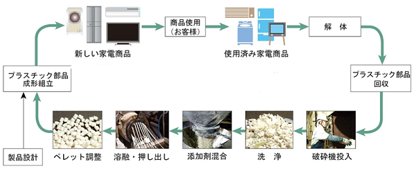 (戸田)当社は、お客さまが使い終わった家電製品からプラスチック廃材を回収し、新しい家電製品の部材として何度もくり返し利用する「自己循環型マテリアルリサイクル」に取り組んでいます。この取り組みは2001年度から開始し、現在では、洗濯機、冷蔵庫、プラズマクラスターイオン発生機などに応用しています。