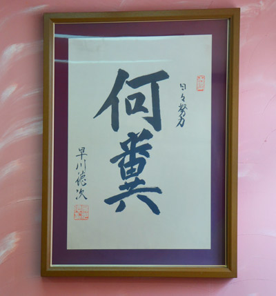 シャープ特選は、1944年、シャープ創業者の早川徳次が、太平洋戦争で失明された軍人のためにつくった「早川分工場」がはじまりです。シャープ特選の社内には創業者の書が何枚も掲げられていますが、中でもこの「何糞」という書は、シャープ特選の原点とも言えるもの。その言葉の力強さが、まるで社員たちを励ましているかのようです。