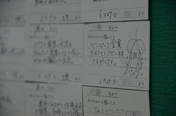 社員のモチベーションアップにつながるものとして、MVPカードという制度もあります。社員同士でがんばった人へのメッセージを書いたカードを食堂の掲示板に貼り出すことで、社員同士のコミュニケーションの活性化に役立っています。