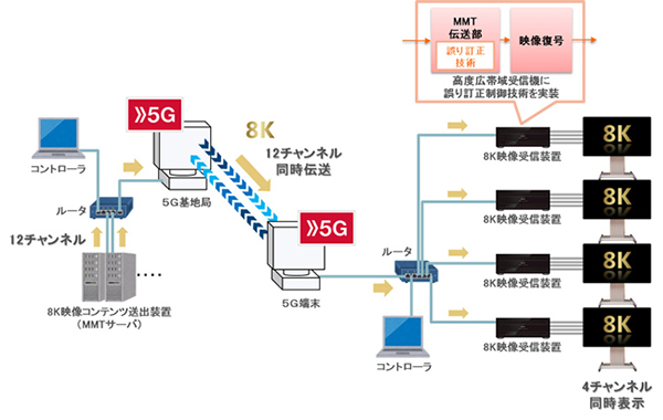 「8Kマルチチャンネル伝送実証実験」システム構成図