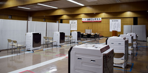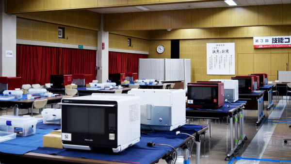 競技内容は、修理の基本作業から始まり、1人で作業するヘルシオオーブンレンジと、ペアで行うドラム式乾燥洗濯機の修理。正確かつ安全な作業が行われているか、また作業時間は適切か、家電に関する知識は十分かなど、総合的に審査します。作業内容は、事前に参加者に知らされていません。会場にずらりと並べられたヘルシオオーブンレンジとドラム式乾燥洗濯機が、参加者たちを待っていました。