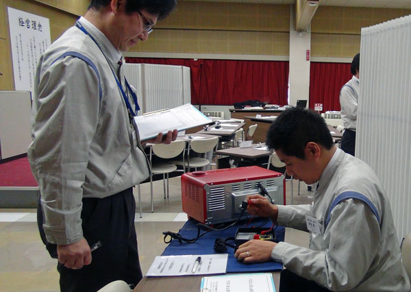 まずは修理の基本作業。リード線の圧着と絶縁抵抗測定をします。間違うと事故につながるため、確実に作業する必要があります。持ち時間はたったの30秒!てきぱきと作業をこなしていきます。