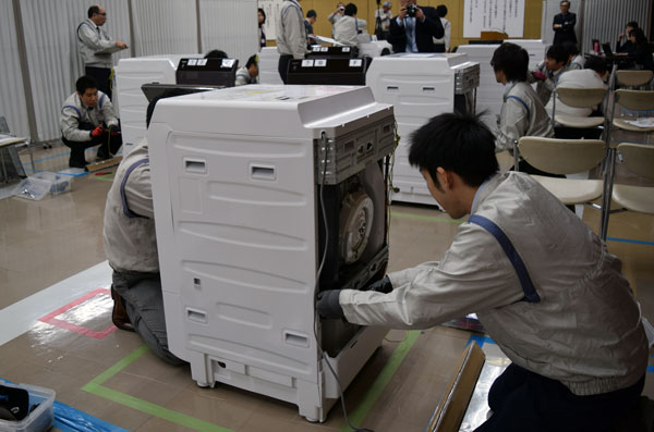 そしてペアで行う作業の部。ドラム式乾燥洗濯機の作業を2人1組で行います。今回用意した機種は発売から日が浅く、修理したことがある人は誰もいませんでした。与えられた課題はDDモーターの交換。2人で行う作業のため、声をかけあい、手際良く分担して、協力しながら進めなければなりません。実は、このペアは当日、くじびきで決められました。初めて顔を合わせる相手とペアを組み、息の合った作業ができるのか、腕の見せどころです。