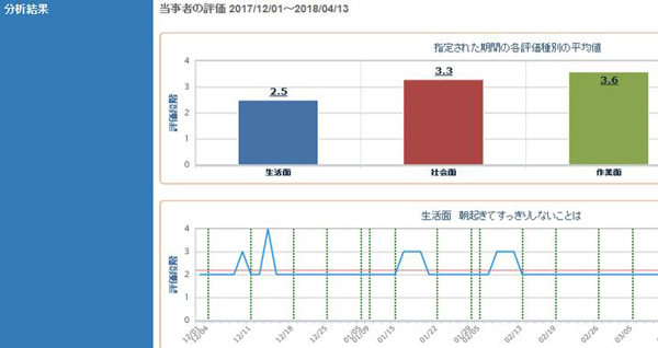(石垣)簡単にいうと日報のようなものです。当社と同じように、障がい者を多く雇用している大阪のシステム会社さんが開発したシステムなのですが、日々の出来事に加え、自分自身の気持ちや体調などを入力でき、それがグラフ化されるような仕組みになっています。長期的に使うと、どういう時にしんどくなるのかといった傾向把握につながることもあり、障がい者本人だけでなく、周囲の人も対応しやすくなるんです。
