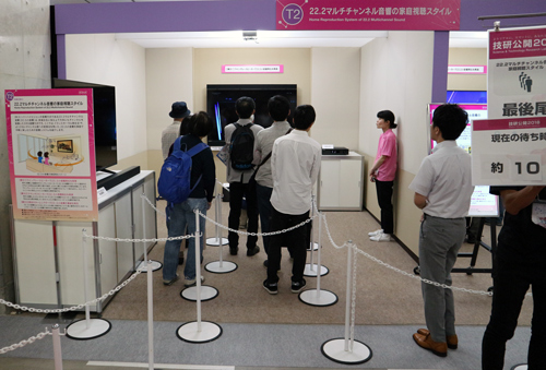 当社との共同研究成果を展示したブースでは、前方に配置した直線状のラインアレースピーカーによって、音楽ライブホールで体感するような側方や後方、上方から聞こえる音の方向感が22.2ch音響によって見事に再現されていました。