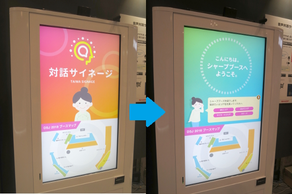 “しゃべるサイネージ”は展示ブース入口での使用を想定したシステムで、見た目はただのデジタルサイネージですが、人が前に立つと認識し、話しかけてくれたり、質問に答えてくれたりします。