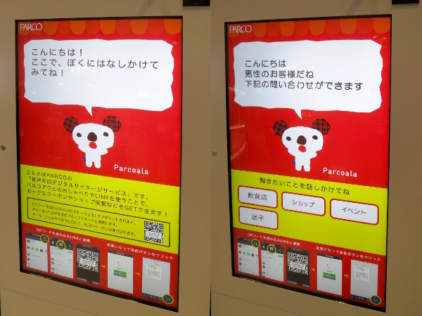 前に立つとパルコアラが気さくに話しかけてくれ、連動して画面には対話できることが表示されます。自動で男女を見わけ、好みなどの質問に答えていくと、お勧めの飲食店やショップ、イベントなどを教えてくれます。