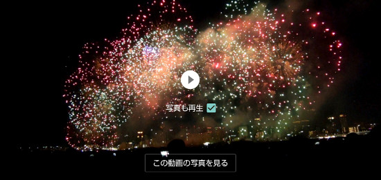 8月4日の「なにわ淀川花火大会」で、動画を撮影しました。撮影後、再生ボタンを押すと動画がスタートし、AIライブシャッターで自動撮影された写真も同時に再生されます。