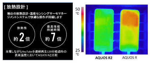 (小野)スマホのカメラで動画を撮るときに困るのが、熱くなってカメラが使えなくなる点です。「AQUOS R2」では動画と静止画の2つのカメラを同時に利用するため、今まで以上に発熱しやすくなります。どんなに素晴らしいカメラシステムであっても、本体の温度が上昇し撮りたいときに撮れなければ、役にはたちません。「最高のカメラをより最適の環境で使えるようにしたい」その思いで、設計の段階から熱対策にしっかりと取り組みました。