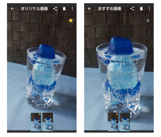 傾いていたグラスがまっすぐキレイに補正されました!ちなみに、この「インテリジェントフレーミング」は2017年発売の「AQUOS R」から搭載された、当社のオリジナル機能です。