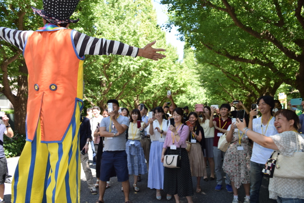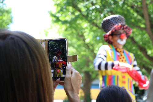 講義の後は実習です。 1人1台貸し出されたAQUOS R2を手に、AIライブシャッターの効果を実感するため、屋外でピエロを被写体に、参加者全員で撮影を楽しみました。残暑は厳しいながら、この日は絶好の撮影日和。道行く人たちが思わず振り返るピエロの楽しいパフォーマンスに、撮影会は大いに盛り上がりました。