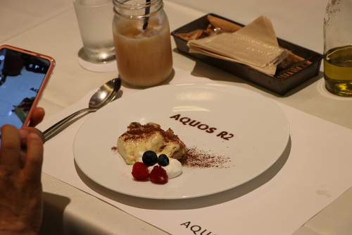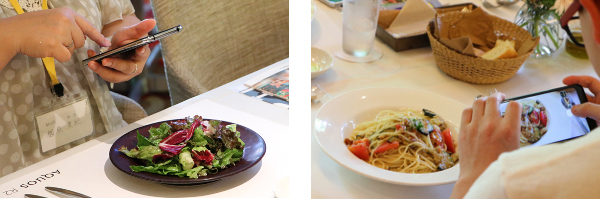 そろそろお腹がすいたところで、ブレイクタイム。目と舌の両方を楽しませてくれる、おいしそうなサラダ、パスタ、特製スイーツが運ばれてきます。先ほど黒田さんから教わった撮り方を早速実践しようと、会場のあちらこちらで、テーブルの花や目の前の料理にAQUOS R2のカメラを向ける姿が見られました。