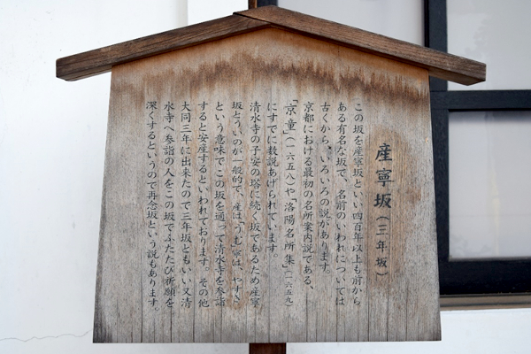 清水寺から少し下ったところに産寧(三年)坂という古い坂道があります。この坂のいわれは諸説あるようで、説明書きにそのうちの2つが紹介されていました。