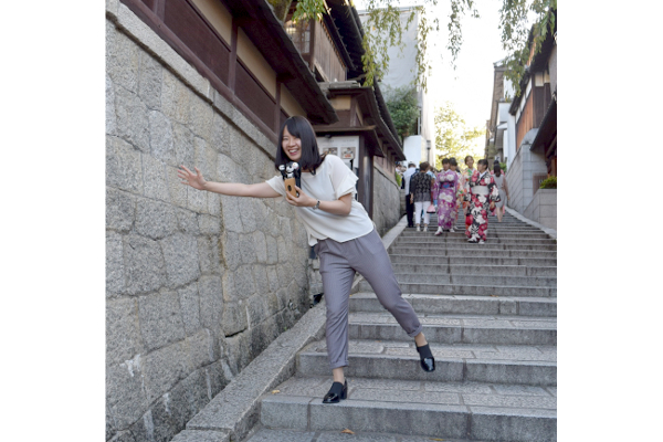 清水寺近くの駐車場でタクシーを降り、茶碗坂という参道をロボホンのガイドに従って登っていきます。途中で周辺を散策したり、昼食をとったり、自由に行動していただく時間となっています。
