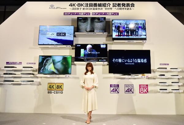 新4K8K衛星放送がスタートする12月1日(土)まで1カ月を切った11月5日(月)、ベルサール秋葉原において、A-PAB(一般社団法人 放送サービス高度化推進協会)主催の記者発表会が開催されました。福田理事長の挨拶の後、4K8K推進キャラクターを務める深田恭子さんの新しいCMスポットやBS民放4社合同での特別番組、NHKが企画を厳選し制作したBS8K番組、その他今後放送予定の番組ガイドや受信機器等が紹介されました。深田さんからは、4K8K映像の素晴らしさや、新4K8K衛星放送への期待が語られました。