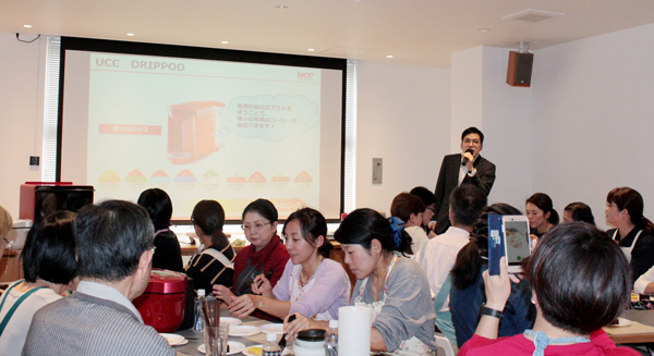 食後には、UCCさまからスイーツ2種と、それぞれに合うUCCの一杯抽出のコーヒーマシン『DRIP POD(ドリップポッド)』のコーヒーをいただきながらコーヒーに関するお話を伺い、和食に合うコーヒーのご提案もいただきました。