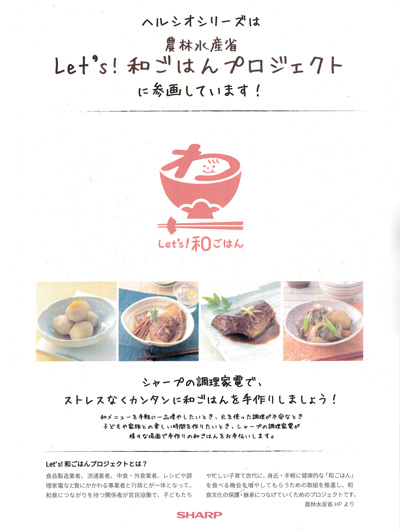 当社のヘルシオシリーズは農林水産省の「Let’s 和ごはんプロジェクト」に参画しており、今回のヘルシオ体験教室もプロジェクトとの協働ということで、Mizkanさまと一緒に考えた和食レシピを皆さまに体験していただきます。