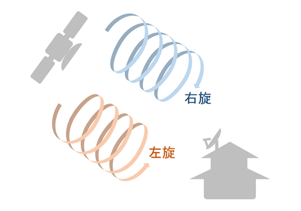 現行の衛星放送では、右回りに回転した「右旋」と呼ばれる状態の電波で地上に信号を送信していますが、4K8K放送の全てのチャンネルを送信するには電波の帯域が足りません。そこで、新放送では、右回りの「右旋」と、左周りに回転させた「左旋」と呼ばれる状態の電波を組み合わせて、各チャンネルの信号が送信されます。