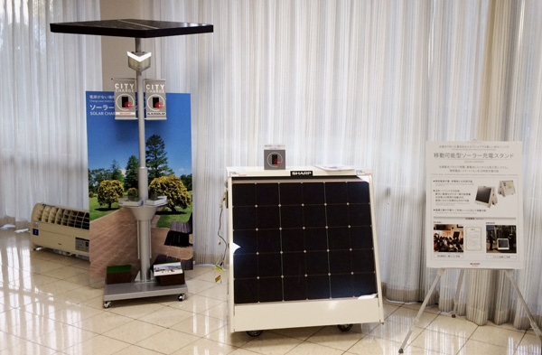 期間限定で、ホールにソーラー充電スタンドを展示していますので、見学の合間に携帯電話の充電にご利用頂けます。
