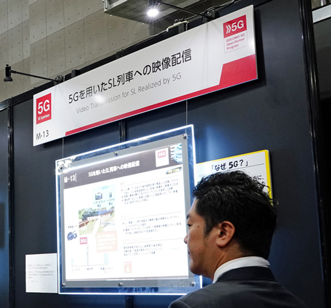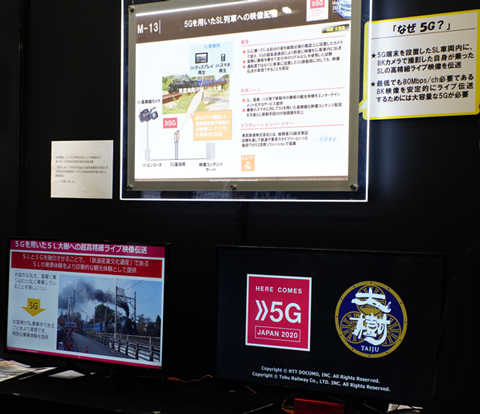 会場には、もうひとつ当社が関連する展示(「5Gを用いたSL列車への映像配信」)がありました。ここでは、11月28日に当社、株式会社NTTドコモさま、東武鉄道株式会社さまとが発表を行った「第5世代移動体通信方式(5G)により8Kの高精細映像をライブ伝送する実証試験」について紹介しています。