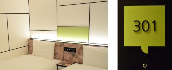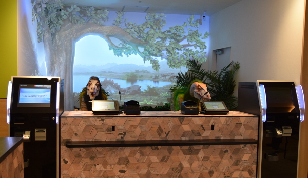 館内では、他にもたくさんのこだわりが見られました。フロントでは、季節に応じて変化するプロジェクションの映像を背景に、2体の恐竜型ロボットがお出迎え。恐竜がスローテンポの声や仕草で応対してくれる姿はなんともユーモラスで、癒される感じがします。客室に入ると、日本文化の発信を意識し、客室の壁のデザインが漫画のコマ割りになっています。また、ルームナンバーの吹き出しのデザインには、ロボットにありがちな無機質なイメージを和らげ、お客さまがホテルに戻られたときに、ホテルからお声がけしているような温かい雰囲気を作りたいとの想いが込められているそうです。