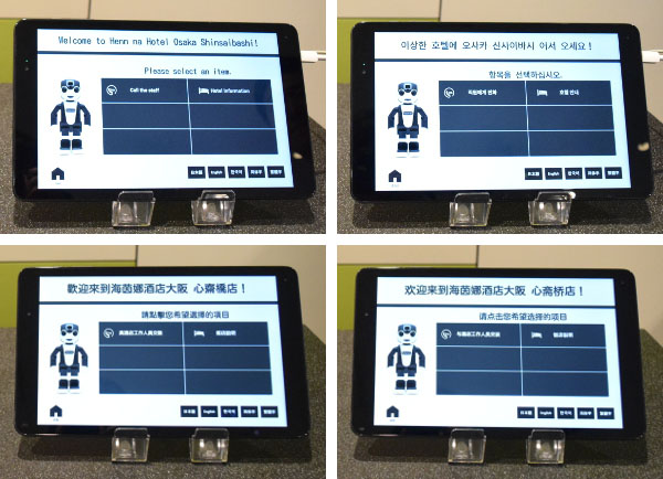ロボホンズから離れて奥へ進むと、正面左横のフロントデスクでもロボホンを発見!館内の設備やサービスについて、案内してくれます。ロボホンにケーブルで接続されたタブレットのメニューから「ホテルのご案内」を選択すると、「ホテルのご案内を表示するよ」というロボホンの音声とともに、チェックイン・チェックアウトの時間、営業時間、食事案内の内容がタブレットの画面から確認できます。