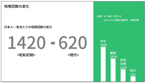 一方で、日本人の一食あたりの咀嚼(そしゃく)回数は時代を追うごとに減り続け、昭和初期の頃と現代を比較しても、半分以下に減少しているという調査結果があります。