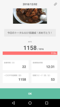 「ごちそうさま」ボタンを押すと、咀嚼回数、食事時間、食事開始時間、ワンポイントアドバイスが表示