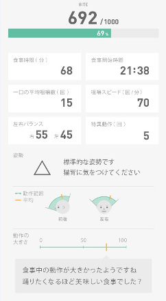 「BH-BS1RL」では、その日の食事内容ごとに、一口の平均咀嚼回数、咀嚼スピード、設定されている目標回数に対する達成率、ワンポイントアドバイスが表示されます。