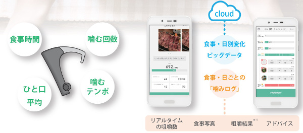 まず「bitescan」本体を耳にかけます。続いて、スマートフォンの「bitescan」アプリの「いただきます」ボタンを押し、食事の内容を選択した後、スマートフォンのカメラで食べる物を撮影し、食事をスタート。最後に食事が終わって「ごちそうさま」ボタン押すと咀嚼回数、食事時間、ワンポイントアドバイスが表示されます。