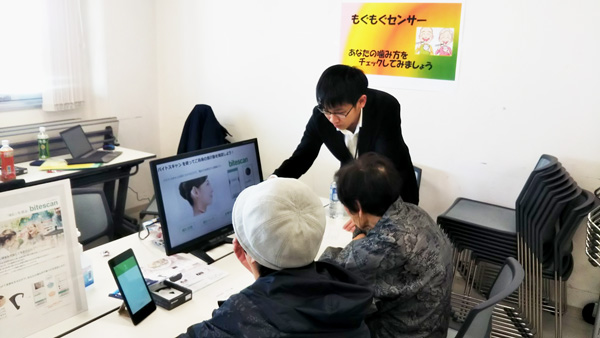 イベントではこの他にも、健康寿命を延ばすために、よく噛むことの大切さをお伝えし、bitescan(バイトスキャン)を使ってご自身の噛み方をチェックする「もぐもぐセンサー」体験も実施し、ご好評をいただきました。バイトスキャンとは、昨年12月に法人向けに当社が発売した、耳にかけて噛む回数や噛み方の癖などを測定できる新しい機械です。