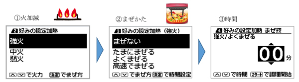 「好みの設定加熱」では、ホットクックを手動で使う場合に、「強火」「中火」「弱火」の3種類の火加減と、「まぜない」「たまにまぜる」「よくまぜる」「高速でまぜる」の4種類のまぜかたを組み合わせることにより、使い慣れた鍋のように調理できます。