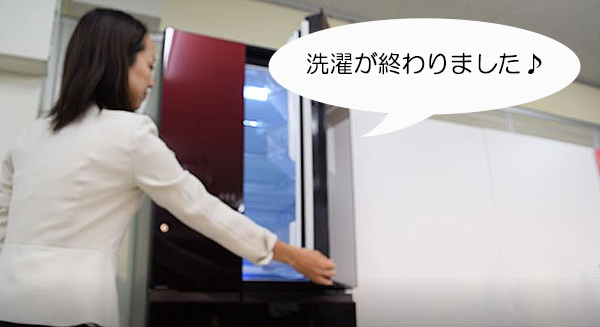 次に、「COCORO HOME」での家電連携についてのご紹介です。当社が提供するスマートホームサービス「COCORO HOME」では、家電の連携ができます。今回洗濯機と連携できるようになったのは、冷蔵庫。え?なんで冷蔵庫と洗濯機?と思ったそこのアナタ!キッチンで家事をしているとき、洗濯の様子が気になることはありませんか?この二つが連携すると、洗濯が終わったときに冷蔵庫が「洗濯が終わりました♪」と教えてくれます。今まで無意識にしていた、洗濯機の様子を見に行く手間がなくなります。単純なことだけど、嬉しいですね!