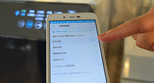 また、洗濯機と連携し、使用する洗剤をスマホから登録すると、洗濯量にあわせた洗剤量を教えてくれます。最近はたくさんの種類の洗剤が売られていて、目移りしてしまいますよね。洗剤の種類を選ぶだけでなく、詳しい商品名まで指定することができます。数種類の洗剤を使い分けたいときも、それぞれの洗剤を使用するうえで最適な量がわかります。