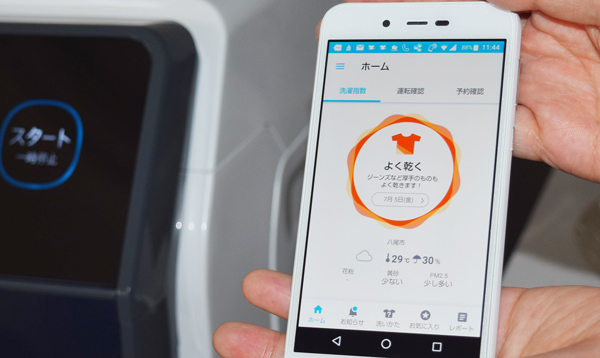 当社が提供するAIoTクラウドサービス「COCORO WASH」では、専用のスマホアプリでお洗濯のアドバイスをします。天気予報と連動し、雨が降りそうな日は乾燥機能の使用を勧めてくれたり、天気が良い日はジーンズなど厚手のものの洗濯を勧めてくれたりするんです。残り時間など洗濯機の運転状況や次回の洗濯に役立つ洗濯レポートの通知といった機能もあります。