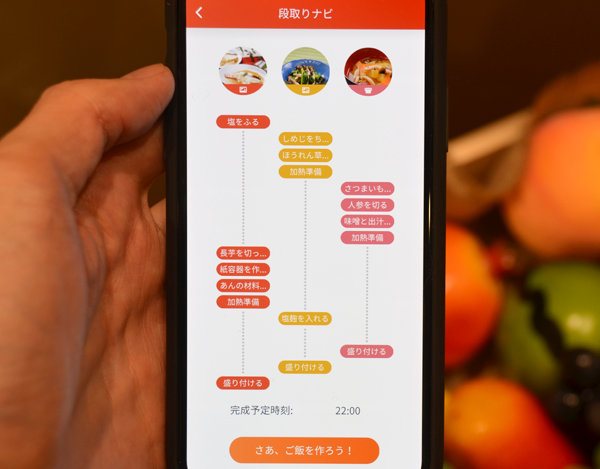 料理の上手な人は、複数の調理を手際よく同時にこなしますよね。食材を切り、茹でている間に、別の調理の下ごしらえをする。そんな調理の「段取り」について深く考え、AIにより「段取り」良く調理ができるよう各工程をおすすめする、というサービスのプロトタイプです。