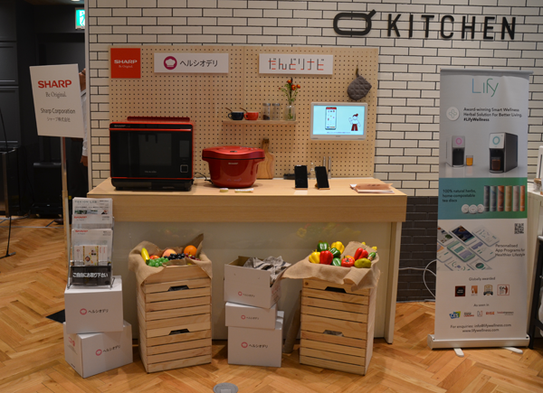 講演会場に併設された展示ブースでは、様々な企業や団体が食に関する最新の製品やサービス、コンセプトなどを出展。当社は、複数の料理の調理手順をわかりやすく教えてくれる「だんどりナビ」サービスのプロトタイプと、料理キット宅配サービス「ヘルシオデリ」などを展示しました。