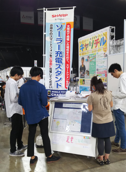 「環境広場さっぽろ2019」にて、太陽光で発電した電気でスマートフォンを充電する「ソーラー充電スタンド」を展示