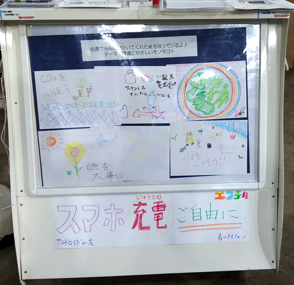 背面には、A1サイズまでのポスターを掲示することができます。この日は、「環境にやさしいモノやコト」をテーマに、来場した子どもたちが描いた絵を飾りました。